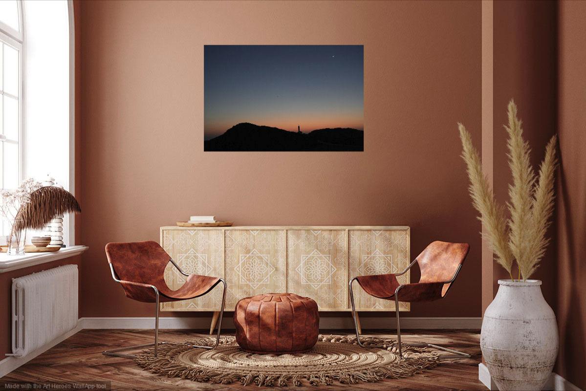 6h36. Octobre 2023. Il n’y a pas d’accès direct au phare de Favaritz. Après avoir marché une trentaine de minute sur un petit chemin dans le noir, seulement guidé par le joli croissant de lune, que nous arrivons devant ce tableau d’ombre chinoise.